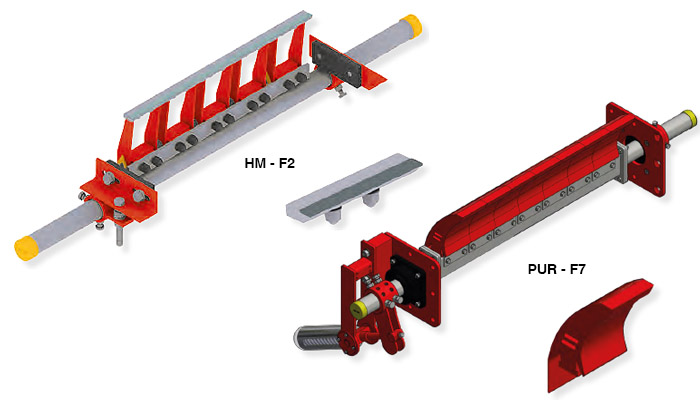 La serie REMA TIP TOP F están diseñados para la limpieza de la faja en la polea de cabeza. Se encuentran disponibles varios sistemas con cuchillas de metal duro (hard metal : HM) o barras raspadoras hechas de poliuretano (PUR)