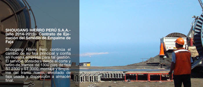 Marcona - Ica - Corte y retiro de tramos de 1300 pies de faja ST2300 y ST3000, montaje y empalme de tramos nuevos, enrrollado y puesta en almacén de tramos usados.