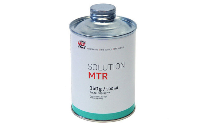 - Solución acelerante para revestir las partes raspadas en el interior del neumático, la superficie raspada del embudo o la goma de unión de los parches de reparación REMA TIP TOP antes de laminar con goma MTR.